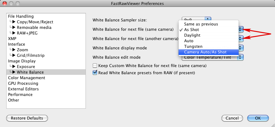 - to the "next file" white balance drop-downs in Preferences->White balance: White balance for the next file (same camera) & White balance for the next file (another camera): if RAW metadata contains Camera Auto WB that we can read, it will be applied to this shot, otherwise As Shot white balance will be applied.