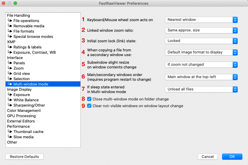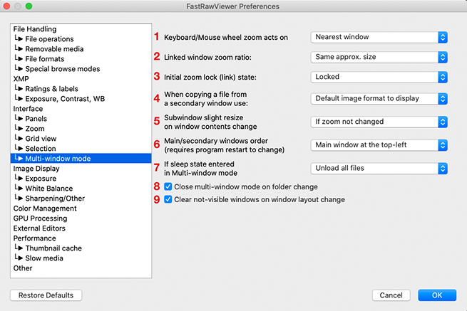 The settings for Multi-window mode are located in a separate Multi-window mode tab of FastRawViewer Preferences.