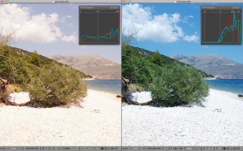Let’s take a look at a typical “training” shot for a holiday – noon of a sunny day, blue Ionian sea, bright white limestone pebbles, bushes with dark-green, high-detail leaves (which lose all detail if the shot is underexposed), deep shadows under the bushes. These types of scenes typically have a very wide dynamic range. We will see later, however, that the real range of the shot we are examining is pretty much only 8 EV, if the exposure is technically correct.