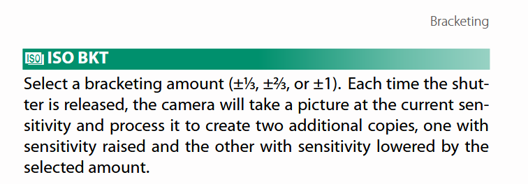 A quick look through the manuals of other Fujifilm cameras revealed the fact that it is not only in the X-H1 that bracketing by ISO was done in this manner. The same description is contained in the manuals for X-Pro2, X-T3 (X-Pro1 as well, but it's inconvenient to hyperlink to this description directly - so, please go to the page 35 manually).