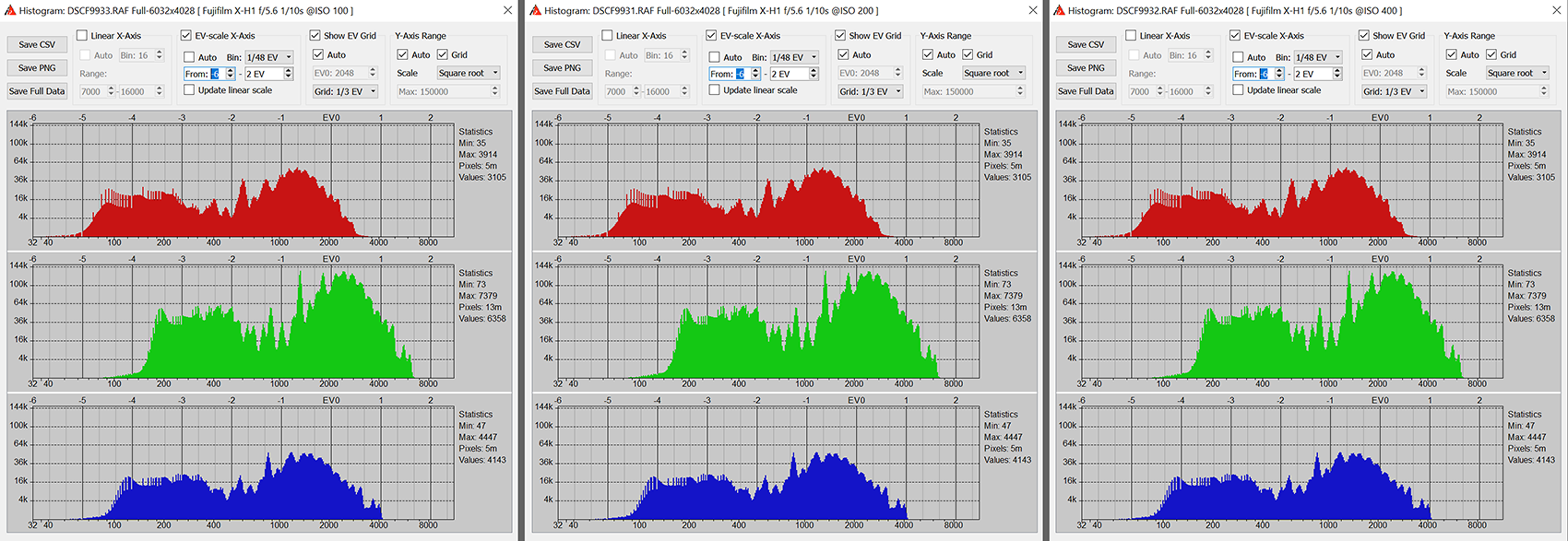 RawDigger. Raw histograms for shots with ISO 100, 200 and 400. Fujifilm X-H1