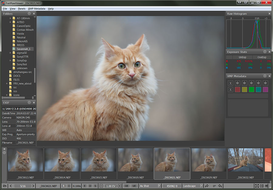 - Filmstrip/Thumbnails panel previews the current folder's files. The thumbnails are extracted from the previews built into the RAW files; if the RAW file has no preview (such as with Cinema DNG), then the thumbnail isn't displayed. Aside from the thumbnail, the panel optionally shows the file name, rating, XMP label, title, and description. What exactly is displayed and how it is displayed can be controlled through the 'settings' button (gear) on the panel title.