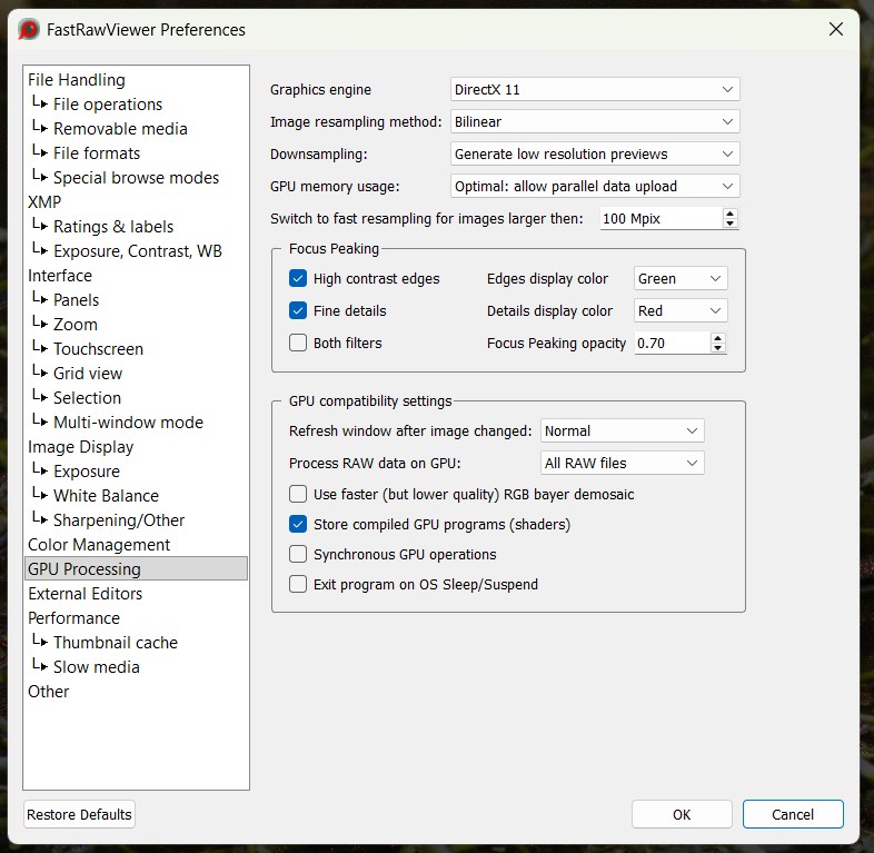 I'm a photo hobbyist. Been using FRV for several years to cull-out RAW images, but never tried to fine tune it. My rig is relatively fast with plenty of storage from the two SSDs, i7-8core CPU, 32GB RAM, and a RTX 4060 card. I have just downloaded and installed the newest FRV, 2.0.10, but have not changed any of the chosen preferences that came with the download. I was wondering what changes, if any, in GPU Processing, as a starter, might be beneficial. Of course, any other suggestions will be appreciated. BTW, I am very happy with FRV, but feel there are probably some tweaks that would even make it better? Thanks.