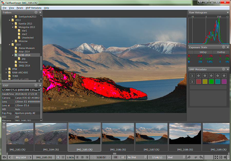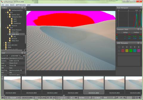 FastRawViewer offers several tools to analyze the exposure on a photograph, recommend exposure adjustments during a shooting session, and select exposure adjustment during RAW conversion: