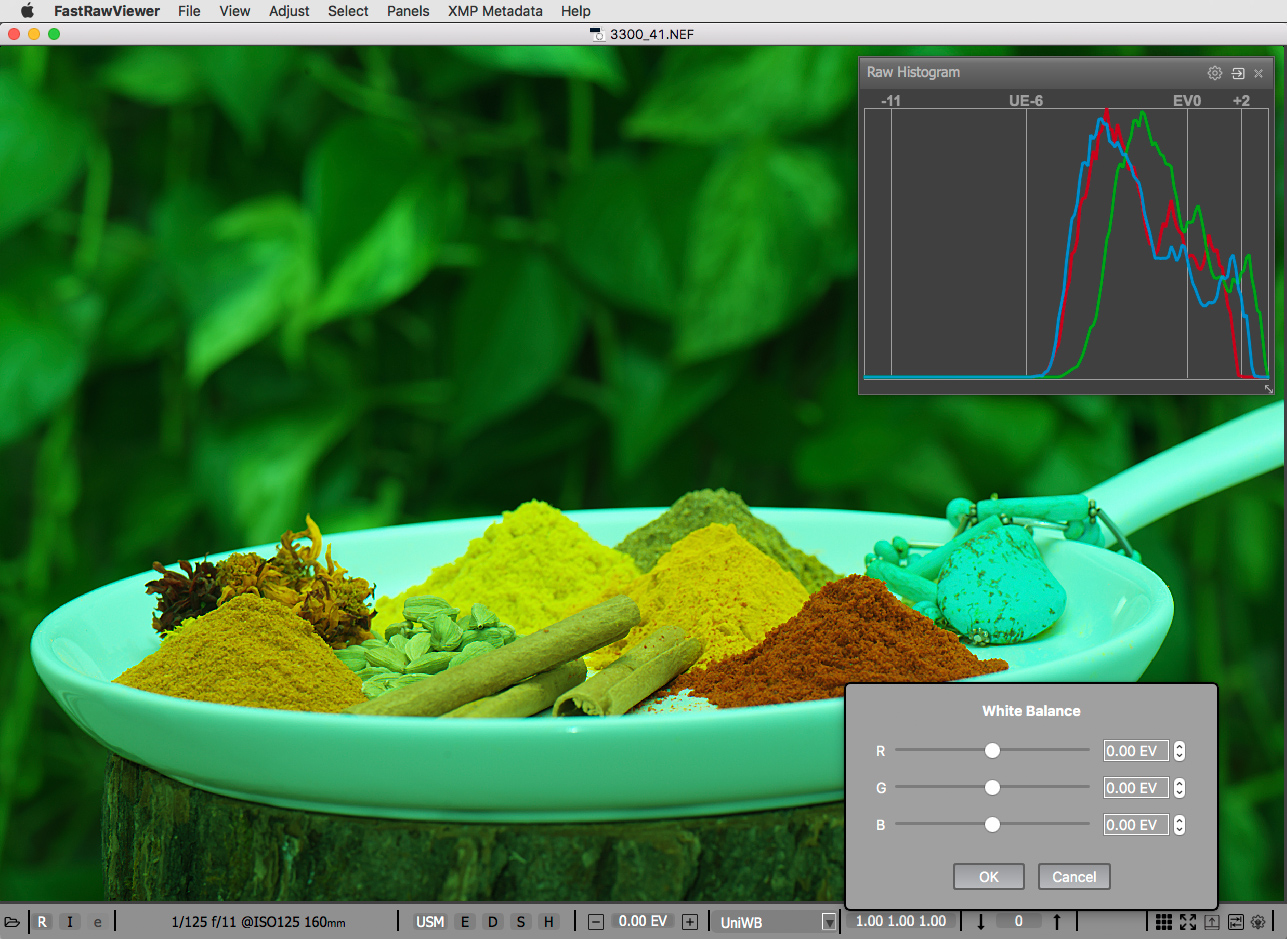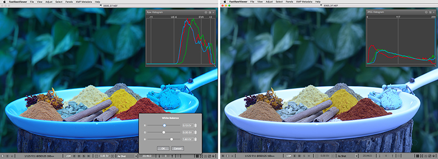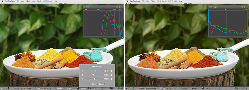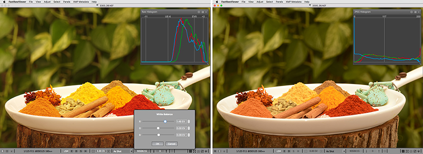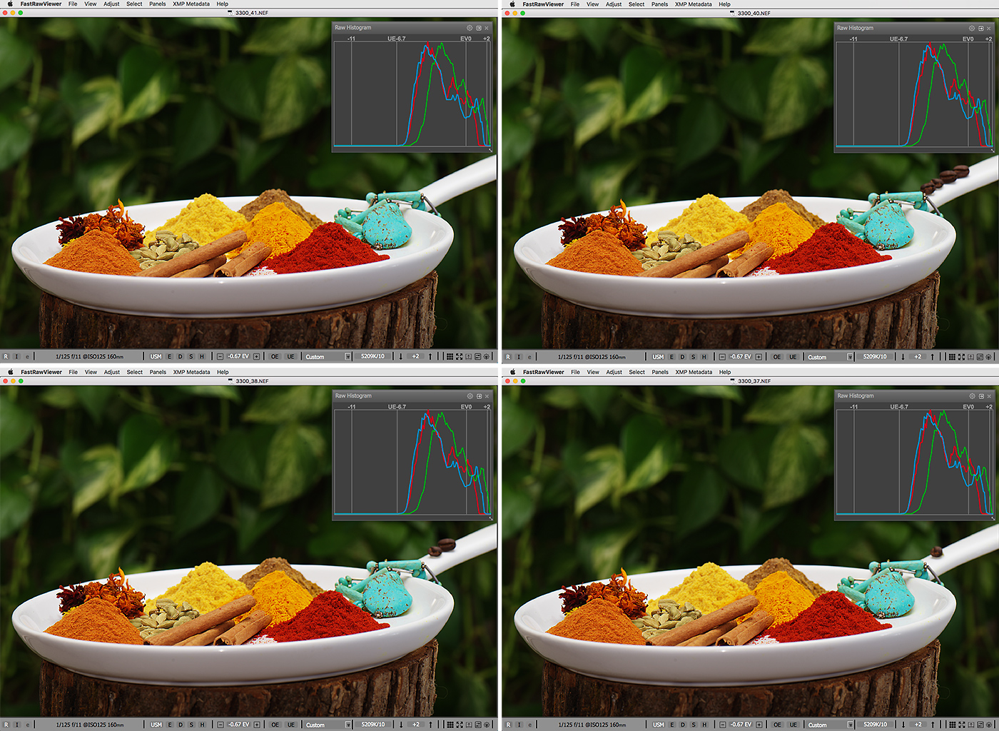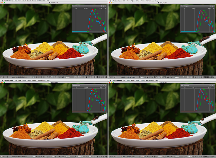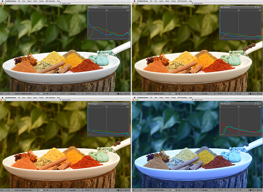 Figure 2. RAW displayed with the same custom white balance applied. All RAW histograms remain the same