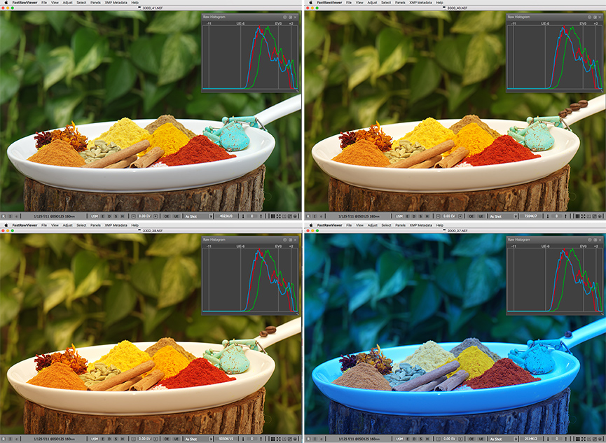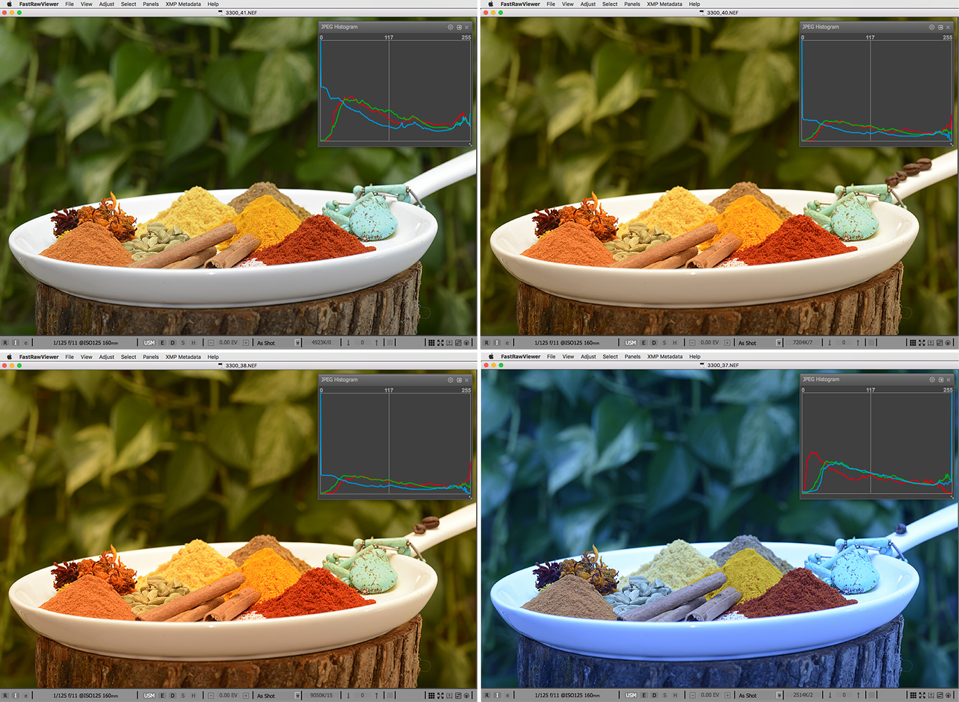 As you can see the "as shot" color differs dramatically between the shots, yet the RAW histograms of these shots are, for all practical purposes, the same.